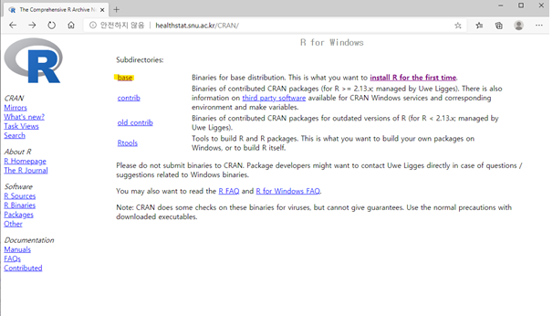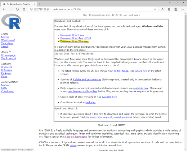 저는 http://healthstat.snu.ac.kr/CRAN/ 여기서 받아보겠습니다.