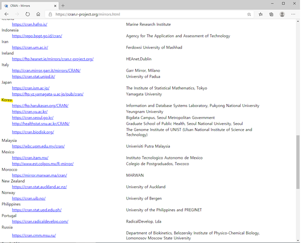 cran 안에서 Korea를 찾아가서 아무곳에서나 받아도 됩니다.
