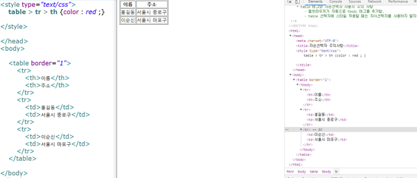 옆에 적용된 코드를 보면 tbody 라는 입력하지 않은 코드가 들어가 있습니다. 우리가 생각할 때, 행과 열로 테이블이 구성되어 있다고 생각하고 작성하면 브라우저가 테이블을 처리하는 알고리즘에 의해서 바디에 영역에 해당된다는 의미로 스스로 추가합니다.