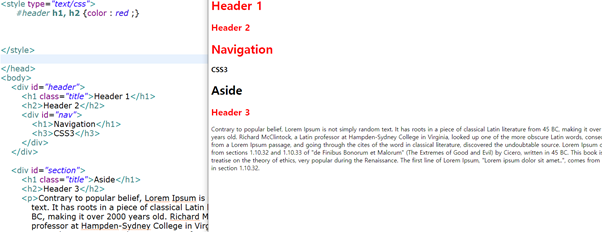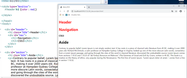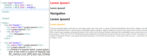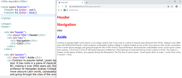 후손과 자손의 차이는 후손은 h1의 내용이 다 선택되지만 , 자손은 부모 태그 바로 밑의 내용만 선택되어 적용됩니다.
