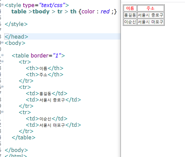 * table 태그와 자손선택자 사용시 주의 사항