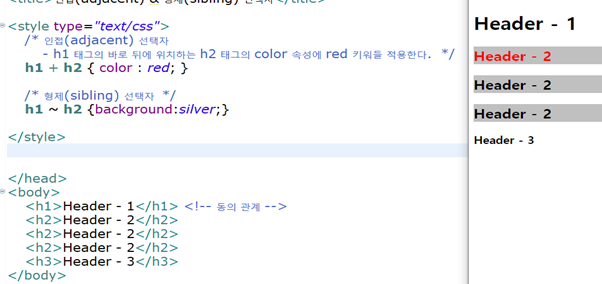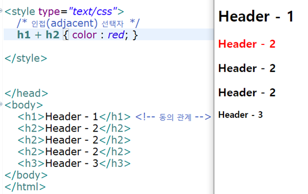 기준이 되어지는 선택자의 동의 관계에 있는 바로 따라붙는 h2가 선택이 되어집니다.