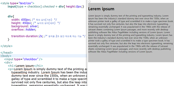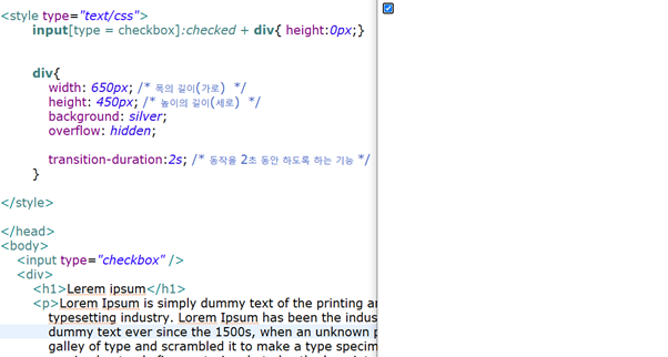 체크 박스를 눌렀을 때, 높이가 0px로 바뀌도록(사라지도록) 만듭니다.