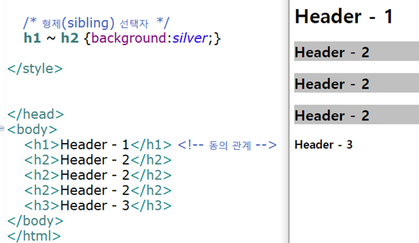 동위 선택자 : 같은 태그(대등한 관계)인 태그들