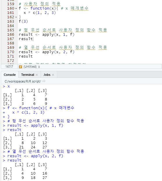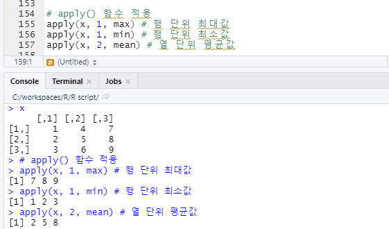 Apply( matrix 구조 객체 , 1(행) or 2(열) , 기능)