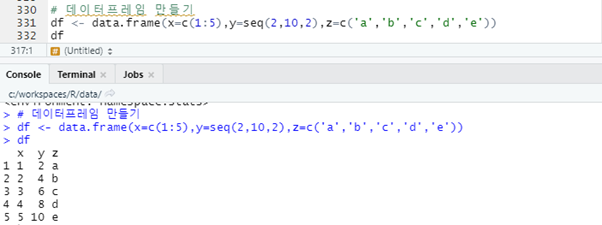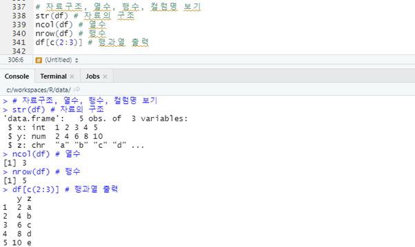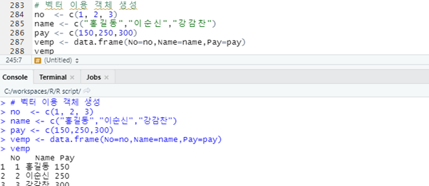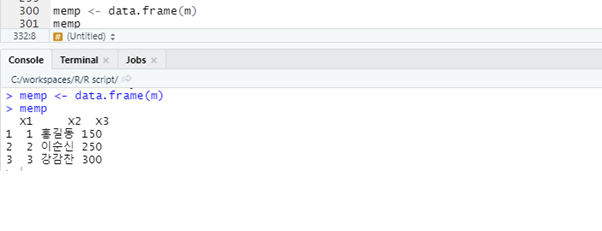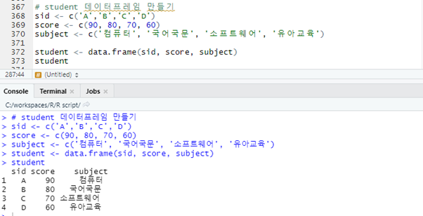 수집된 데이터를 가지고 data.frame으로 만들어서 사용하는 것이 일반적입니다.