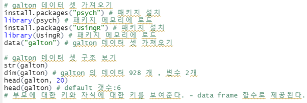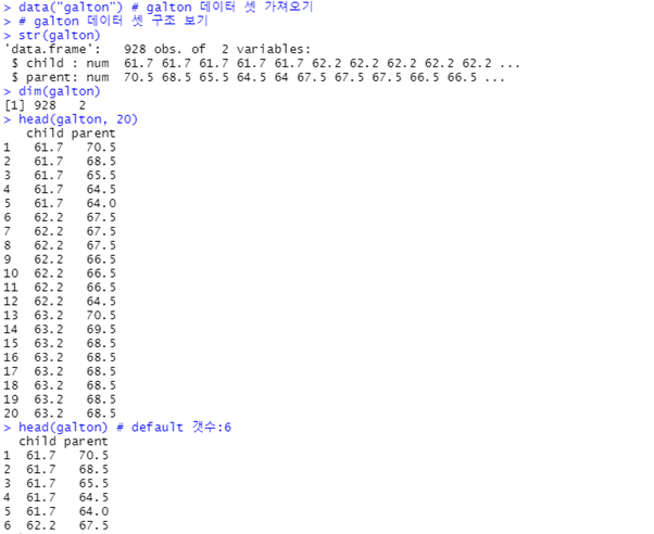 galton은 psych 패키지에서 제공되는 데이터 셋으로 갈턴에 의해서 연구된 부모와 자식의 키 사이의 관계를 기록한 데이터를 제공합니다. 전체 관측치는928개 이며 2 개의 변수 (child 와 parent) 를 제공합니다. 프랜시스칼턴(Francis Galton)은 영국 유전학자로 우생학 창시자 종의 기원를 저술 한 찰스 다윈의 사촌입니다. 우생학이란 유전학 의학 통계학을 기초로 우수 유전자 증대를 목적으로 한 학문입니다.