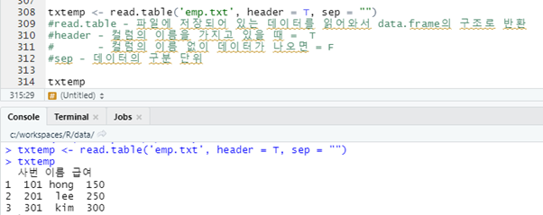 read.table - 파일에 저장되어 있는 데이터를 읽어와서 data.frame의 구조로 반환