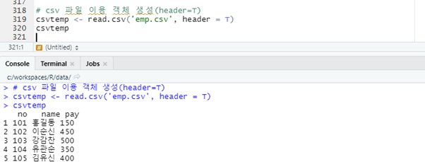 - T , 컬럼의 이름을 가지고 있음, data는 두번째부터 읽어가라