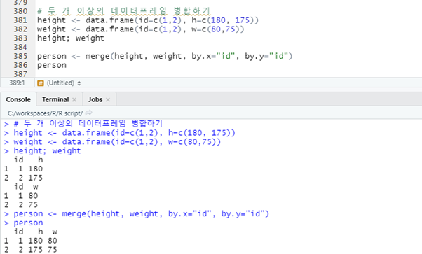 한사람에 대한 데이터가 두개의 데이터로 분리되어 수집했을 때, 데이터 셋을 병합하여 구축할 때 = merge 함수를 이용