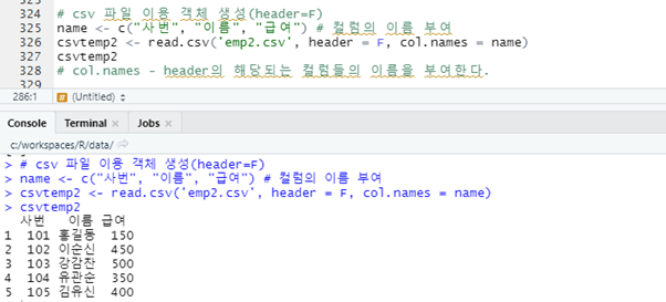 col.names - header의 해당되는 컬럼들의 이름을 부여합니다.
