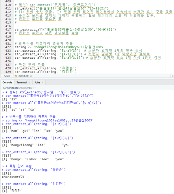 형식 str_extract('문자열', '정규표현식') , extract = 추축, 발췌