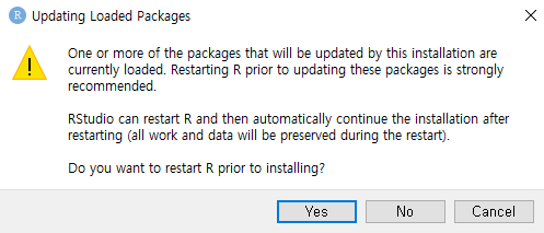 패키지가 설치되어 있다면 위의 팝업이 떠서 yes를 누르면 업데이트 된 것으로 다시 설치 됩니다.