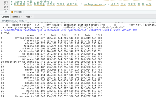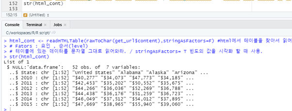 readHTML : 테이블에 있는 데이터를 문자열 그대로 읽어와라. / stringAsFactors= T 빈도의 값을 시각화 할 때 사용.