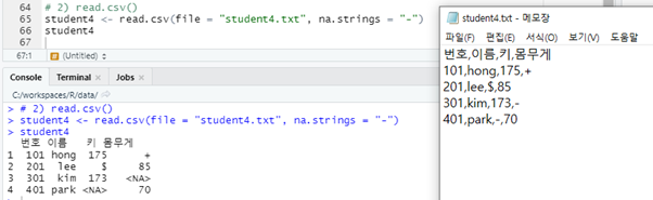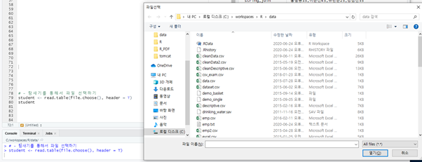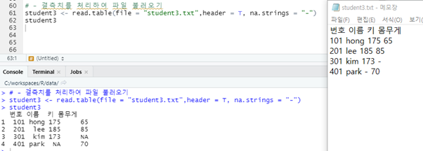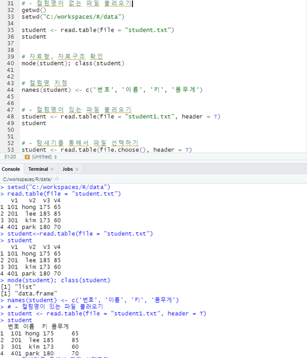 탭키구분자 : student2 <-read.table(file="student.txt", sep="\t", header=T)
