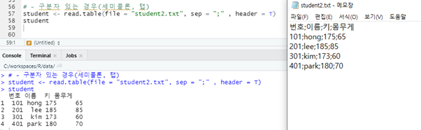 세미콜론 : student2 <-read.table(file="student.txt", sep=";", header=T)