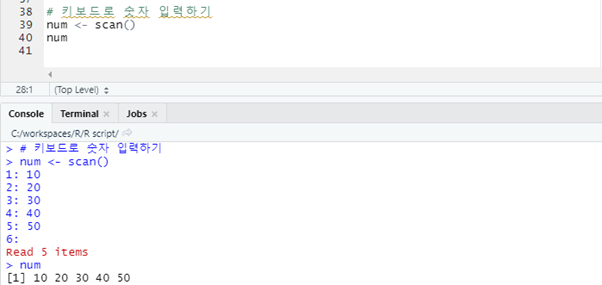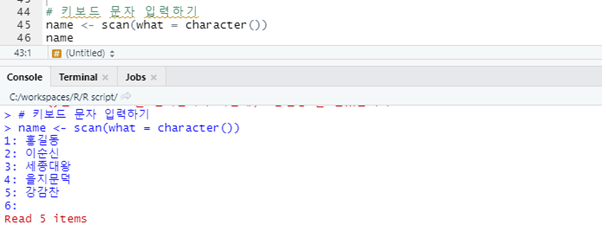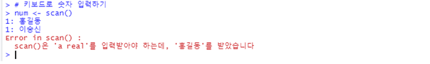 하지만 What이라는 매개변수에 character()을 넣어주면 문자를 입력 받을 수 있도록 합니다.